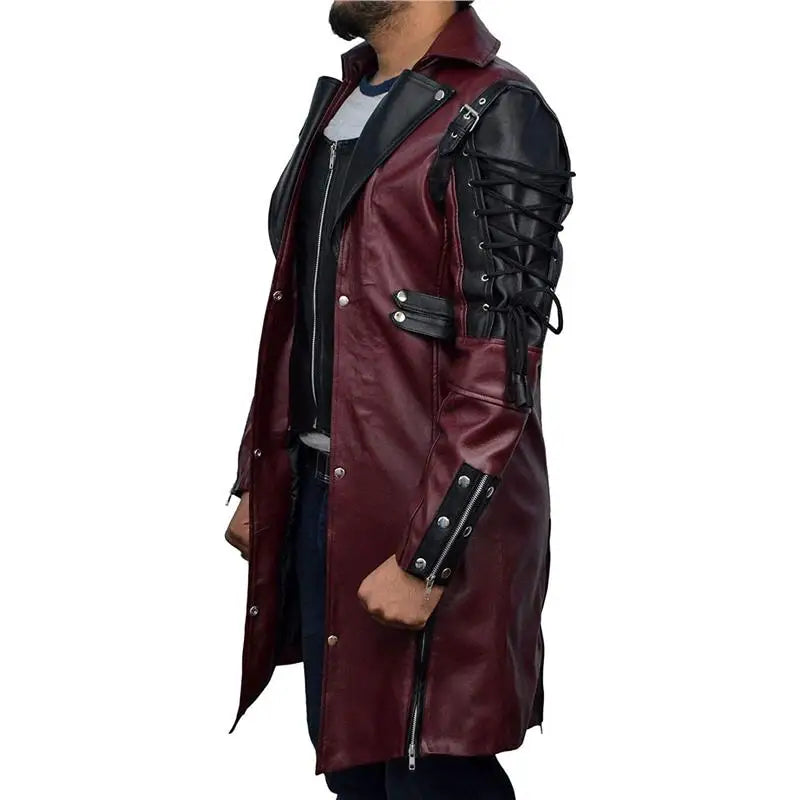 Lange bordeauxrode en zwarte imitatieleren jas in post-apocalyptische stijl