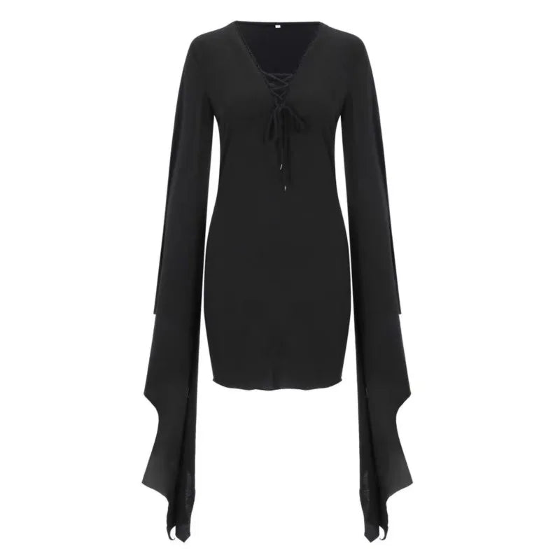 Zwarte gotische vleermuismouwenjurk met gevleugelde mouwen