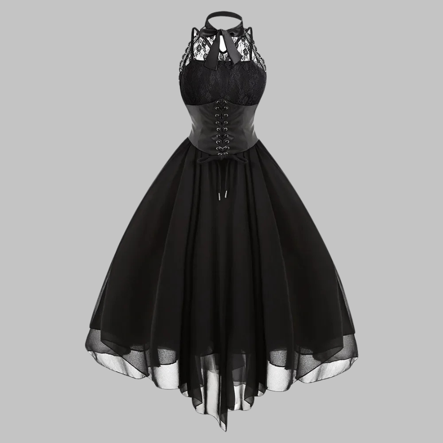 Zwarte Victoriaanse jurk zonder mouwen met kant en tule